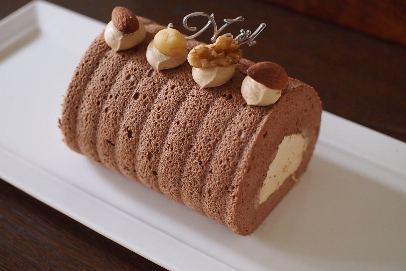 ふわふわ米粉のショコラ生地とカフェクリームがマリアージュ、3種のナッツをトッピングしました。